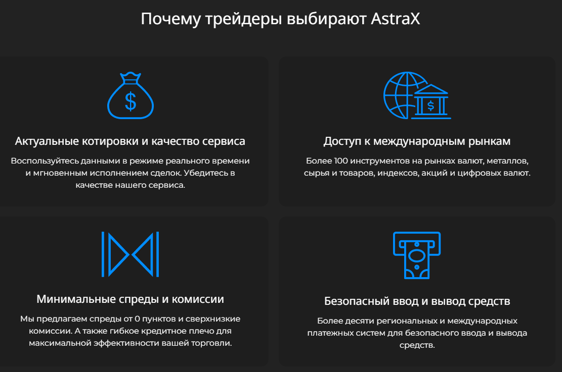 Минимальный депозит нигде не указан на сайте astrax platform com. Спред заявлен от 0 пунктов. Комиссия описана как сверхнизкая. Конкретики ноль. Такая размытость по условиям – красный флаг для любого трейдера.