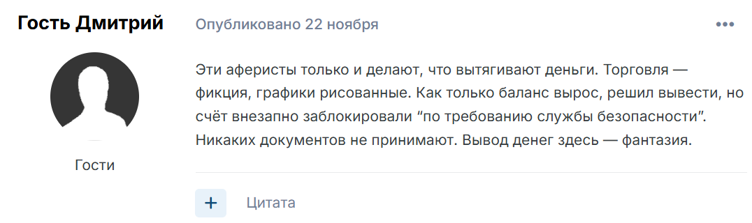Внес 500 000 рублей копил три года! Вывели 50 штук для затравки и все! Домену два месяца вы кто такие вообще! Адрес в Лондоне липа! Графики рисованные я же вижу! Менеджеры давят давай еще давай еще! Саппорт шаблонами отписывается! Условия торговли мутные! Заблокировали вывод клоуны! Я вас из под земли достану!