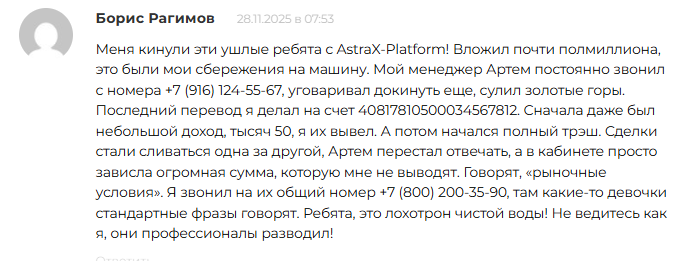 Пользователи делятся негативными отзывами об astrax platform com. Один клиент внес почти 500 тысяч рублей – накопления на машину. Менеджер постоянно звонил и уговаривал увеличить вложение. Обещал заработать быстро и много.