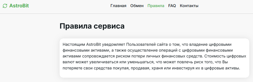 Настоятельно рекомендуем обходить этот ресурс стороной и пользоваться услугами проверенных сервисов. Просим вас поделиться своим опытом. Оставьте отзыв, если уже пользовались AstroBit Io или видели реальные кейсы. Также рекомендуем посмотреть на нашем сайте похожие проекты – там собраны обменники с более развитой репутацией и полными прозрачными условиями.
