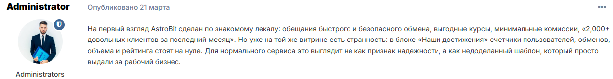 Такой разрыв между «идеальным» внутренним рейтингом и полным отсутствием упоминаний на авторитетных форумах говорит лишь об одном – статистика нарисована. Отсутствие истории в сети при якобы 50 000 проведенных обменов подтверждает нашу догадку о том, что рейтинг AstroBit и отзывы на самом сайте являются фикцией.