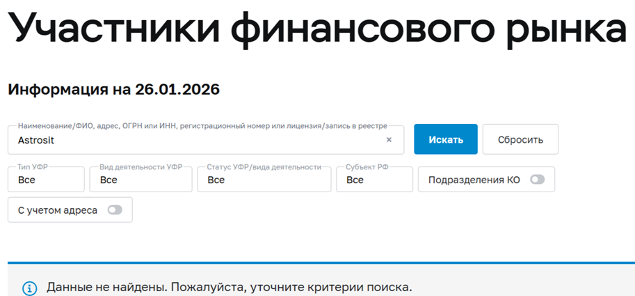 Работать с сайтом Astrosit Exchange нежелательно, поскольку у обменника отсутствует лицензия. Законно действующие сервисы обязательно получают документ, свидетельствующий о легальности. Так как нет лицензии Центрального Банка, это подтверждает, что при финансовых спорах пользователям не предоставляется правовая защита.