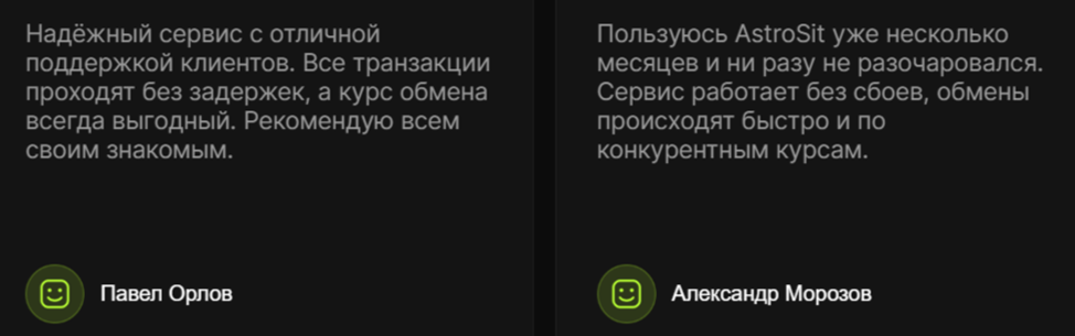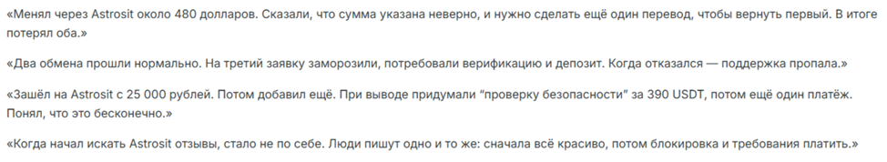 На площадке Astrosit Exchange обещают деньги за отзывы по специальной акции. Если оставить комментарий о сервисе, переводится 2 USDT, поэтому на площадке только хвалебные посты. Пользователи нахваливают площадку и рассказывают о преимуществах. На сторонних площадках размещены только отрицательные отзывы. В них пользователи пишут о финансовых потерях.