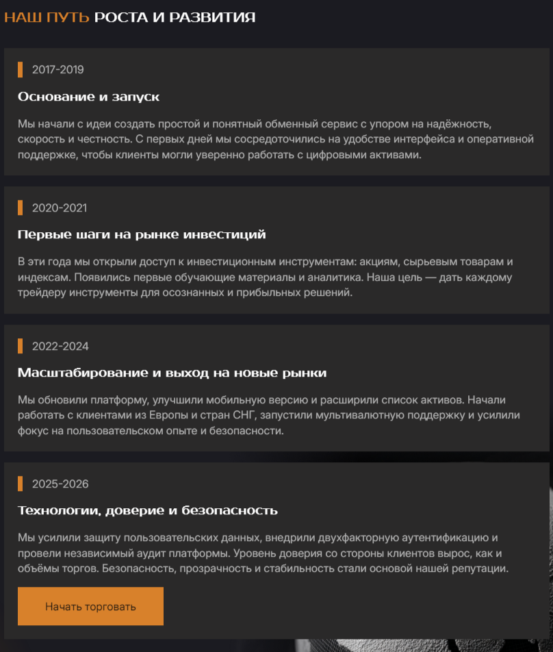 Создатели платформы заявляют, что предлагают свои услуги с 2017 года и имеет в своей базе около 130 тысяч клиентов. Данные факты являются ложью, так как в сети об источнике очень мало информации, плюс, она негативного характера. Об этом говорит и то, что сервис является одним из множества клонов.