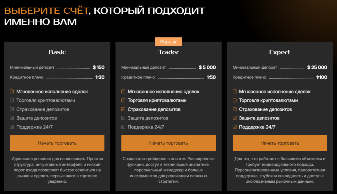 - базовый – с депозитом от 150$ и кредитным плечом 1:20;