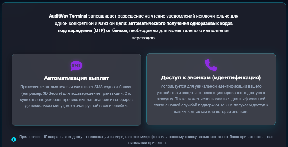 Разработчики акцентируют внимание – установленное приложение запрашивает разрешение на чтение уведомлений для получения одноразовых кодов подтверждения от банков. Согласно сообщению разработчиков, такое решение необходимо для автоматизации выплат.