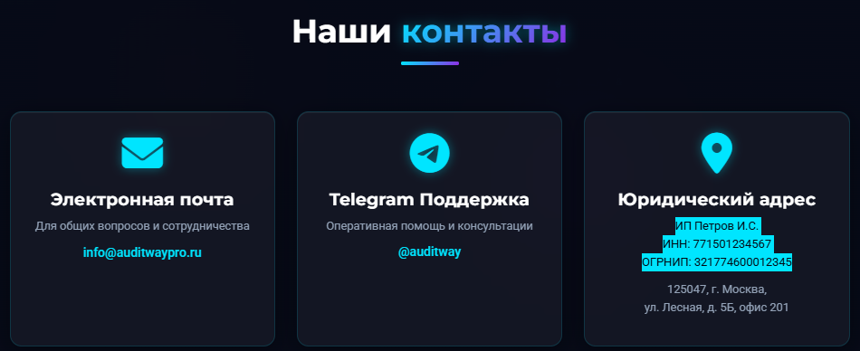 - техподдержка работает через электронную почту info @ auditwaypro ru и аккаунт в Telegram @ Auditway;
