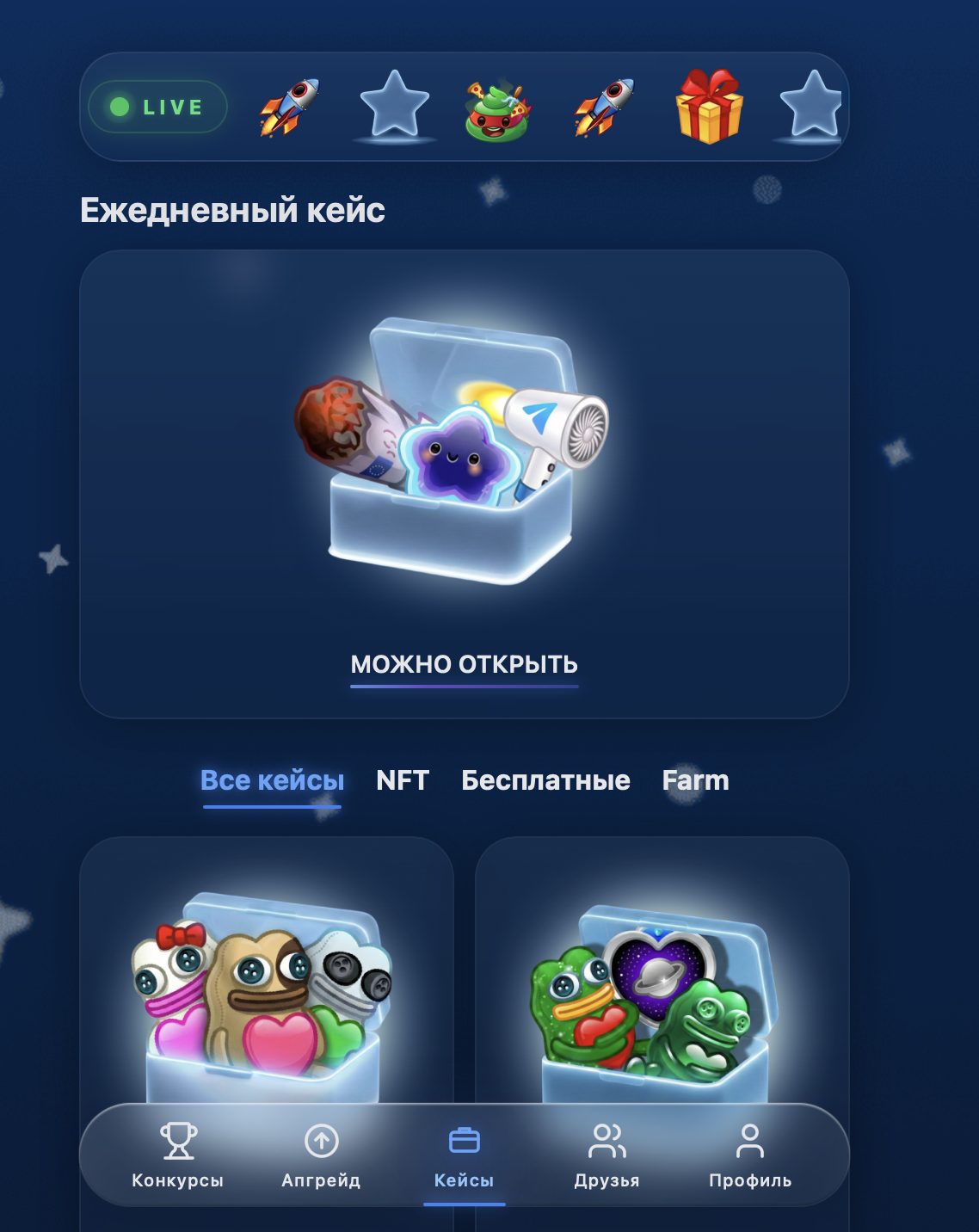 Проект работает по простой схеме: пользователь покупает или получает бесплатно кейс, открывает его через бота, а внутри — случайный набор призов от условных звезд до NFT подарков и специальных апгрейдов. Внутренняя экономика строится на нескольких механизмах — пополнение баланса (TON, внутренняя валюта «звезды», собственные NFT), реферальная система, апгрейды и лимитированные розыгрыши.