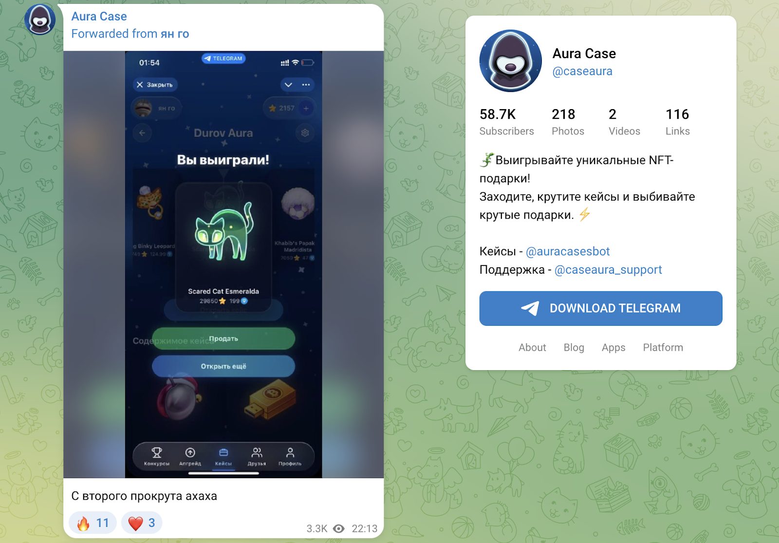 Аура Кейс — бот в телеграмм, реализующий механику кейс-опенинга с внутренней валютой, дропами NFT и системой апгрейда призов. Далее в обзоре подробно рассмотрим работу проекта, контент и публикации, а также, что говорят пользователи о сервисе на просторах интернета.