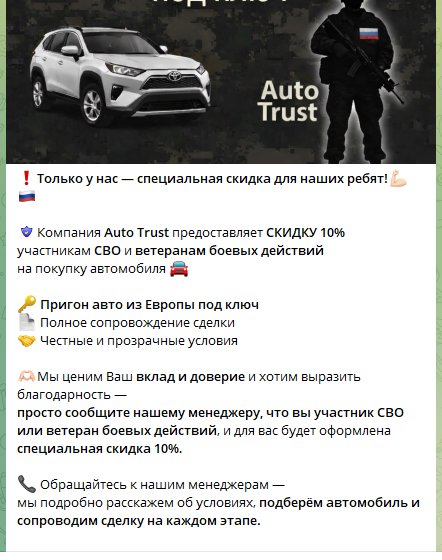 Но в Auto Trust Телеграм-канале публикуются фейковые отзывы клиентов, которые не содержат подтверждений доставки автомобиля или документов. Фотографии с покупателями и «благодарности» не сопровождаются данными о VIN, комплектации или юридической проверке.