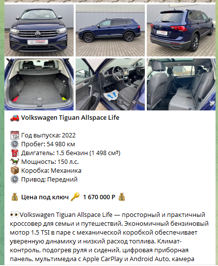 Контент в Auto Trust состоит из карточек автомобилей, якобы готовых к поставке. Публикации включают технические параметры машин, год выпуска, пробег, тип двигателя, мощность, привод, коробку передач и итоговую стоимость «под ключ». В канале представлены внедорожники, кроссоверы и седаны: