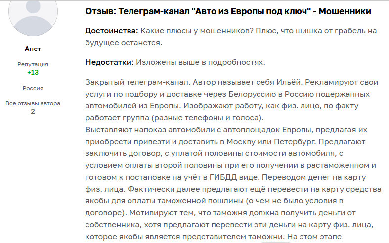 Пользователи в отзывах пишут, что Телеграмм канал Auto Trust ведут мошенники. Легенда про машины из Европы в Auto Trust – фейк. Первую половину стоимости автомобиля клиенты обязательно должны перевести вперед. Далее якобы возникают требования других переводов. Их тоже нужно отправлять на карты физических лиц. В комментариях пользователи жалуются на отсутствие фото-доказательств нахождения авто на таможне, невозможность подтвердить поставку и использование фальшивых счетов-фактур.