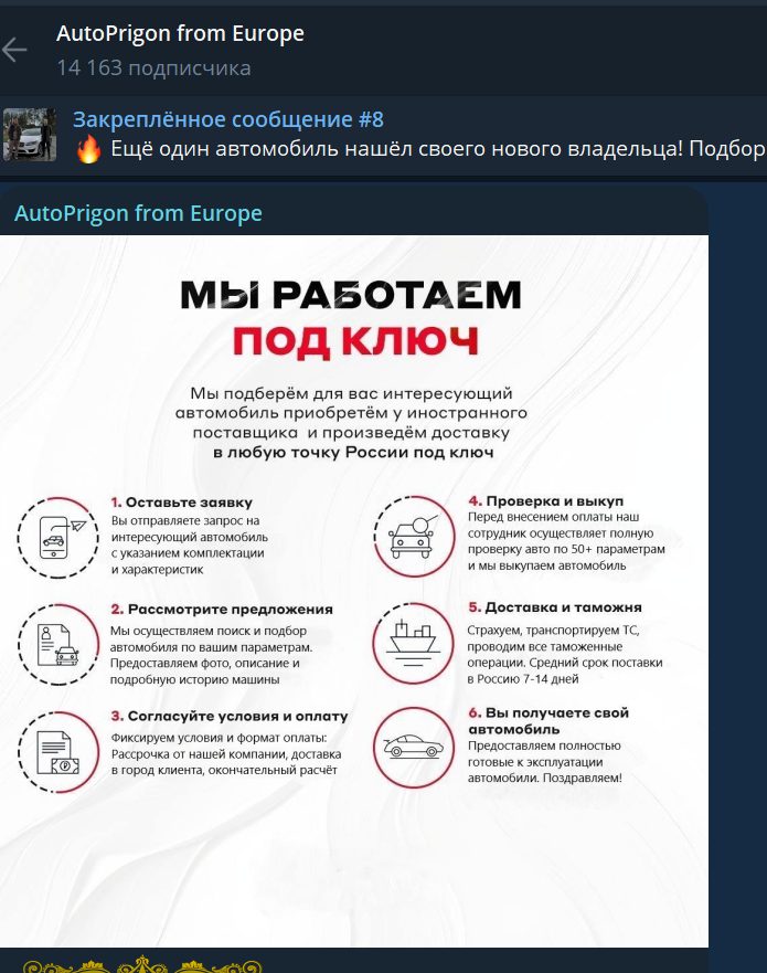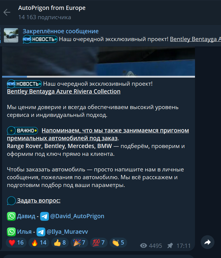 Практически все посты на канале состоят из предложений по привозу автомобилей из Европы, причем владельцы утверждают, что есть даже премиальные модели вроде Bentley. Для связи с представителями проекта представлены контакты менеджеров в WhatsApp и ники в Telegram – Ilya_Muraevv и David_AutoPrigon.