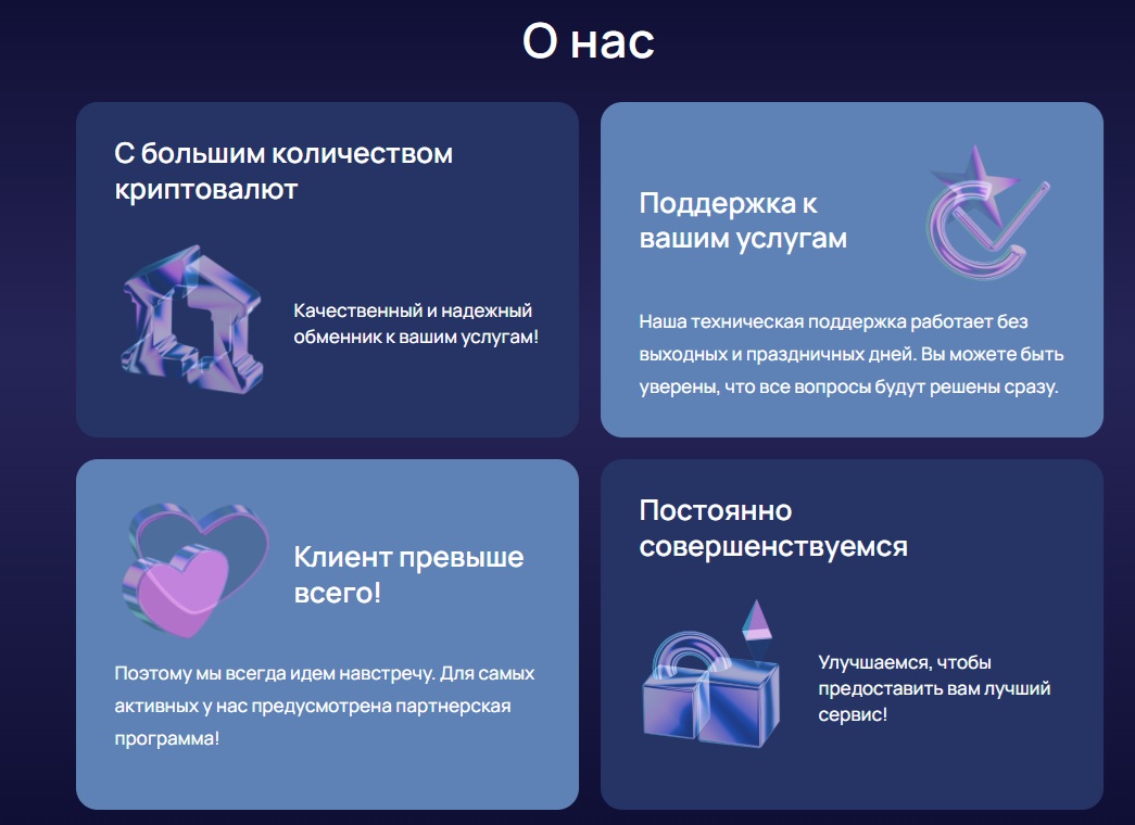 Однако в разделе «О нас» нет никаких подробностей. Непонятно, кто стоит за проектом, как долго он работает. Всё ограничивается общими фразами про надёжность и заботу о клиентах. Единственное, что конкретно указано — поддержка многих криптовалют.