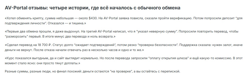 AV Portal: подробный обзор криптообменника, отзывы клиентов, проверка на мошенничество и безопасность операций av-portal.com