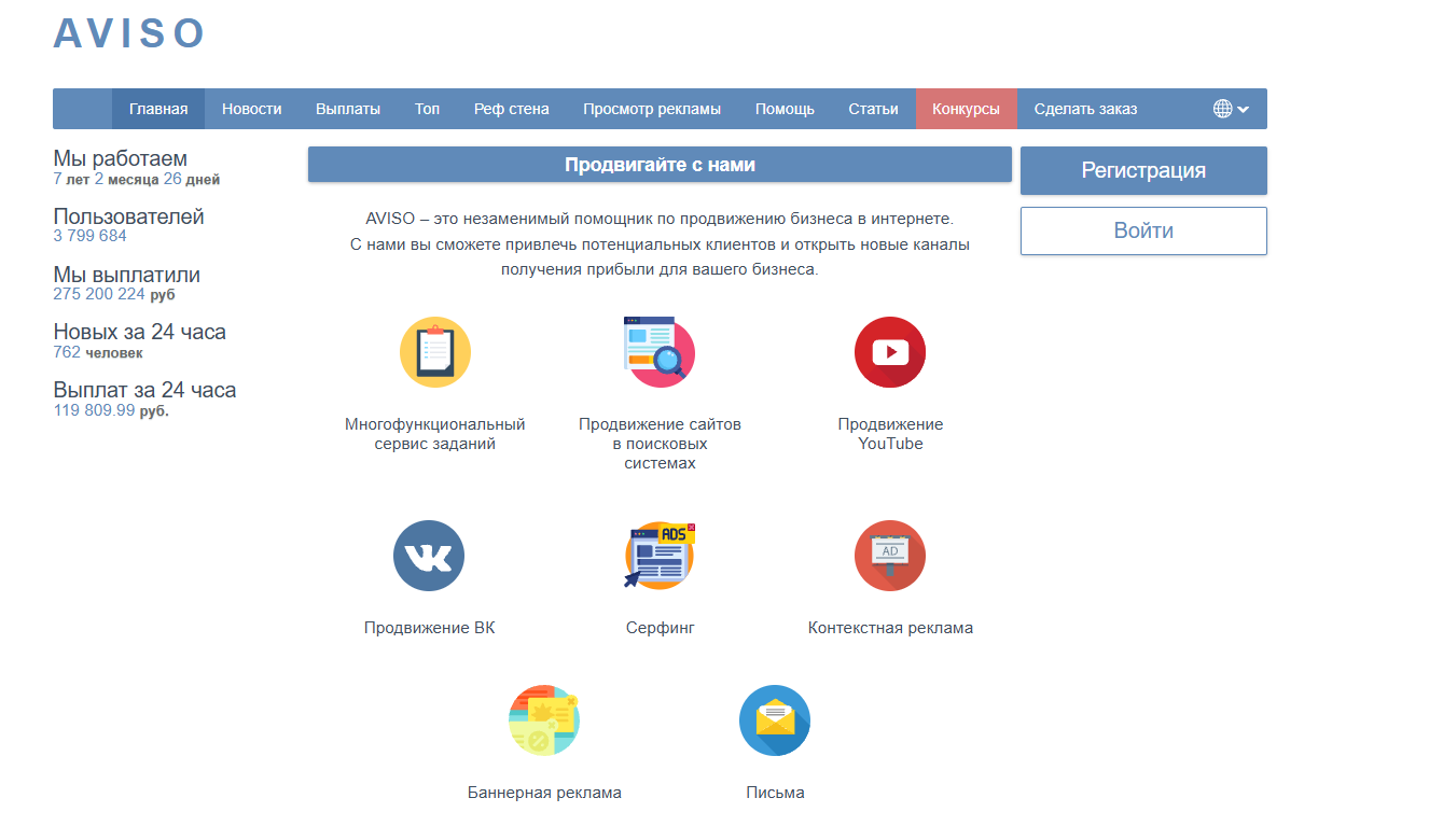 Заработок с «Ависо» реализован через сайт aviso bz – указано, что портал существует около 7 лет. Эта информация подтверждается на практике, так как сервис часто упоминается на внешних ресурсах, но его дизайн кажется устаревшим.