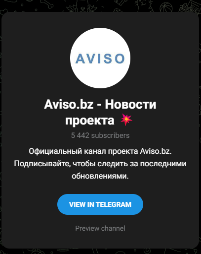 В рамках проекта есть телеграмм-канал @aviso_bz, а также бот @aviso_bz_bot – через него можно было выполнять задания, но в декабре 2025 года он отключен от сервера. При этом нигде не сообщается, почему бот Aviso bz прекратил отвечать на команды пользователей – возможно, это временный технический сбой.
