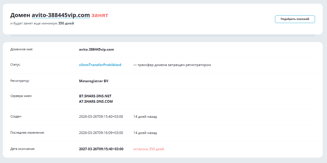 Дата регистрации проекта тоже вызывает вопросы. Домен avito 388445vip com появился в марте 2026 года, но на сайте утверждают, что работают с 2015-го. Эти данные противоречат дате создания домена и никак не подтверждены.