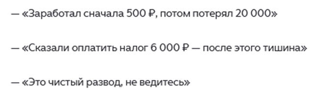 Обманутые участники программы говорят, что заработать и получить деньги можно только в начале. Но это небольшие суммы, которые дают вывести первые 1-2 раза. Затем менеджеры начинают настаивать на увеличении депозита для перехода на следующий уровень.