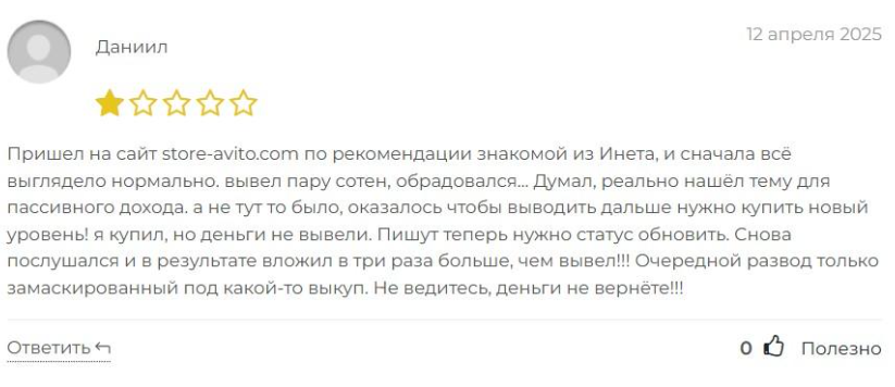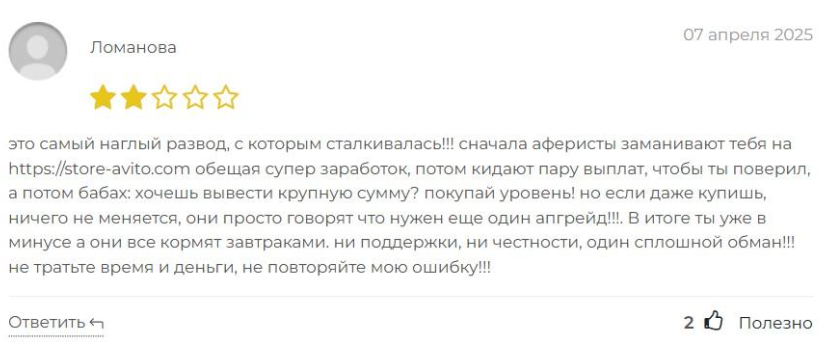 Люди оставляют отрицательные отзывы о Avito Zone com. Один из них пишет, что зарегистрировался в компании по рекомендации знакомой. Он утверждает, что для вывода понадобилось купить новый уровень, но даже после его покупки, автор комментария не смог вывести финансы. Пользователь утверждает, что это развод на деньги и не рекомендует вестись на обещания основателей сервиса.