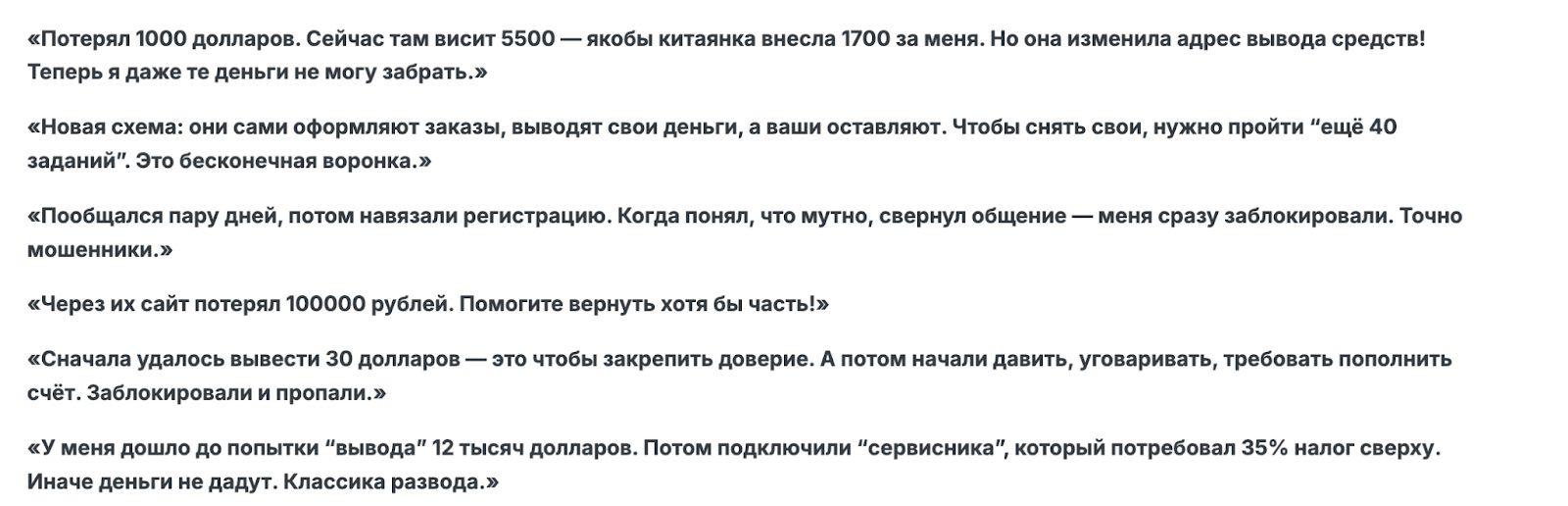 Картина по отзывам о проекте Avorogo Shop складывается крайне тревожная. Пользователи описывают типичную для мошеннических схем динамику, когда сначала создают ощущение доверия и легких денег, а затем — искусственно загоняют человека в долговую яму и невозможность вернуть свой баланс. Это выглядит как бесконечная воронка, где каждый шаг — новый повод попросить пополнить баланс или задержать вывод.