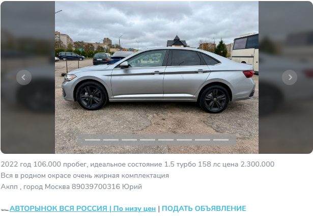 Большинство публикаций представляют собой объявления о продаже автомобилей. Например, в одной из них рекламируют машину 2022 года выпуска. Купить ее можно за 2,3 млн руб. Продавец — частное лицо, некий Юрий из Москвы.