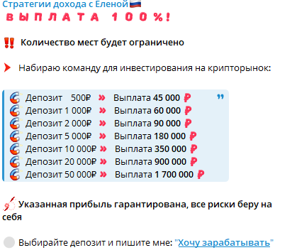 Перейдя в ее блог, мы видим очевидный скам-проект. Мошенница призывает «инвесторов» присылать ей деньги, обещая в течение суток прибыль х100 и больше к депозиту. Такой доход в принципе невозможно обеспечить. Данный «развод» рассчитан на доверчивых людей и распространен в Телеграмм.