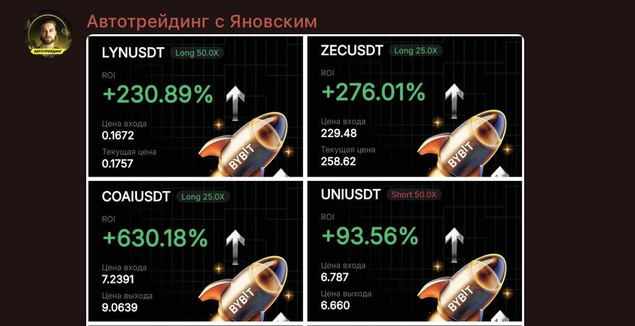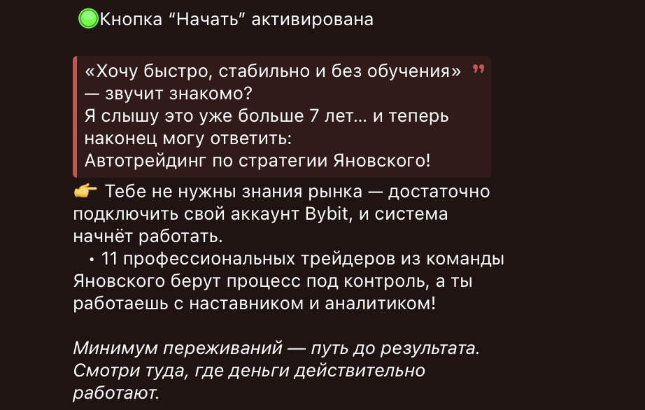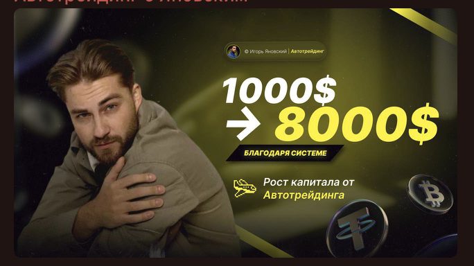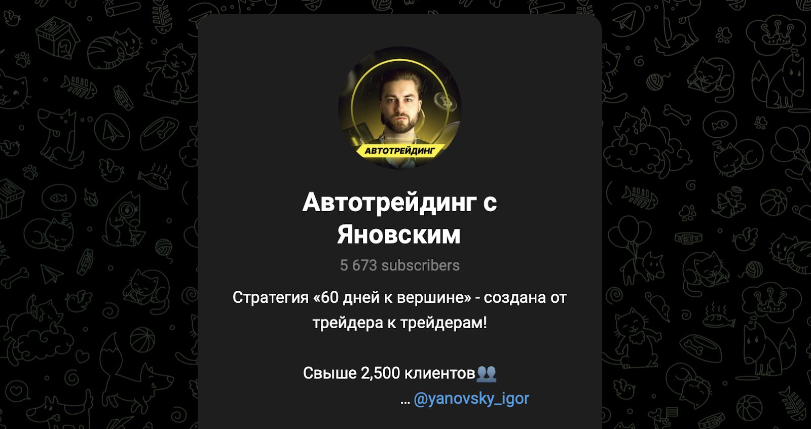 Телеграм-проект «Автотрейдинг с Яновским» возглавляет некий трейдер по имени Игорь, называющий себя экспертом по автоматизированному заработку на крипте. Он заявляет, что является автором уникальной стратегии, которая позволит «разбогатеть» всего за два месяца. Стратегия Яновского основана на копитрейдинге и уже не раз фигурировала в различных схемах скама.