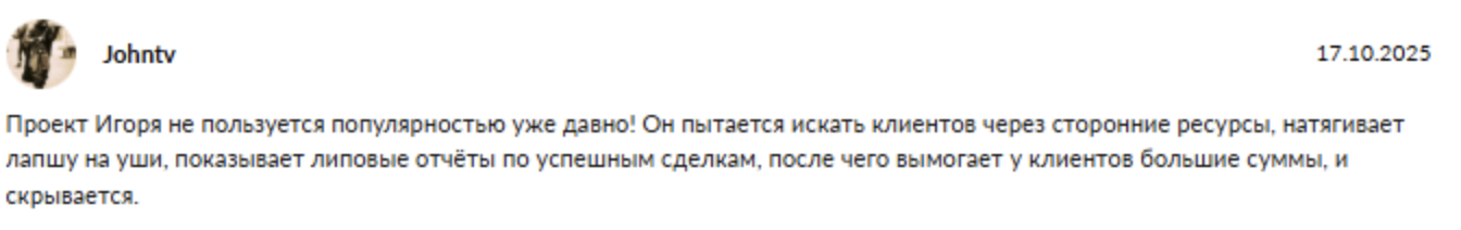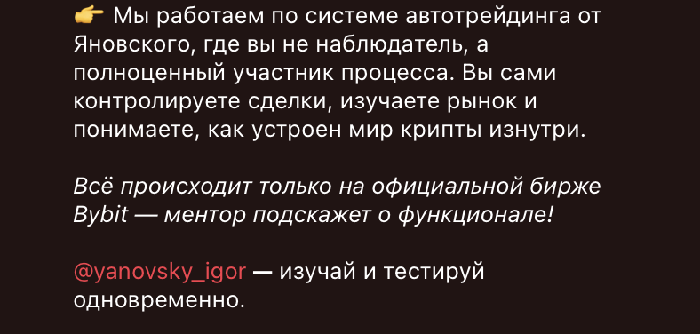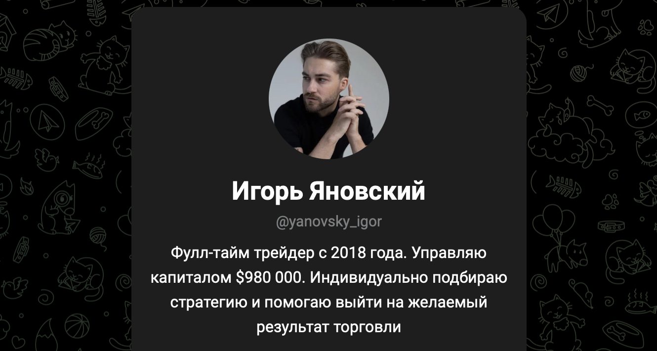 На всех каналах Игорь Яновский твердит о том, как реализовал свой трейдерский стартап всего за два месяца. Чтобы узнать о деталях сотрудничества, он предлагает писать ему в личные сообщения на профиль yanovsky igor. Также он часто записывает телеграм-кружки с обращениями к подписчикам, в которых напоминает о выгоде реферальной программы и торговли на Bybit.