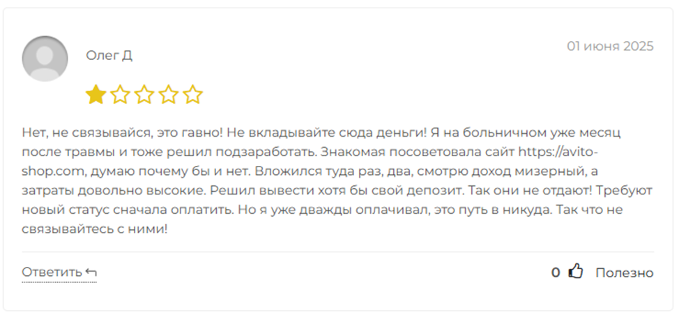 Как отмечают пользователи в отзывах об Avyto Su Com, работа проекта связана со скамом. Он заключается в том, что задания на выкуп клиентам выдаются по цепочке. То есть пропустить или отказаться нельзя, так якобы сгорает весь заработок и внесенные средства. Таким образом клиентов вынуждают платить все больше и больше, повышая стоимость товаров для выкупа.