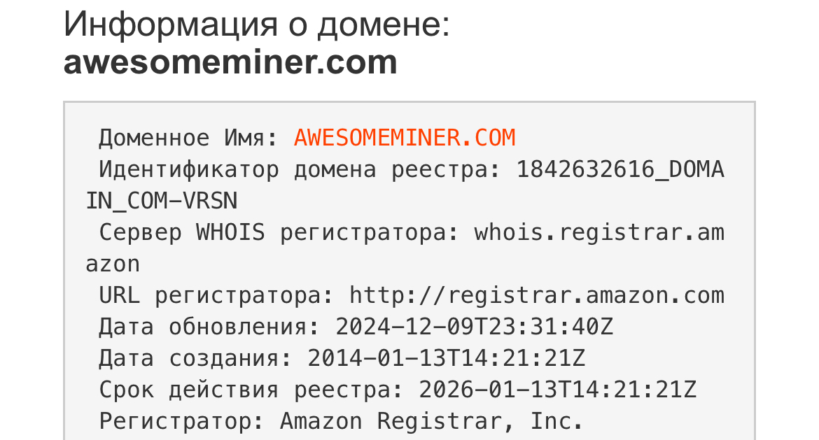 Мы проверили домен площадки через WhoIs. Выяснили, что создан он в 2014 году, а после ее обновление было в декабре 2024. В качестве регистратора выступил Amazon Registrar. Явных нарушений или проблем с сайтом «Авесом майнер» нет.