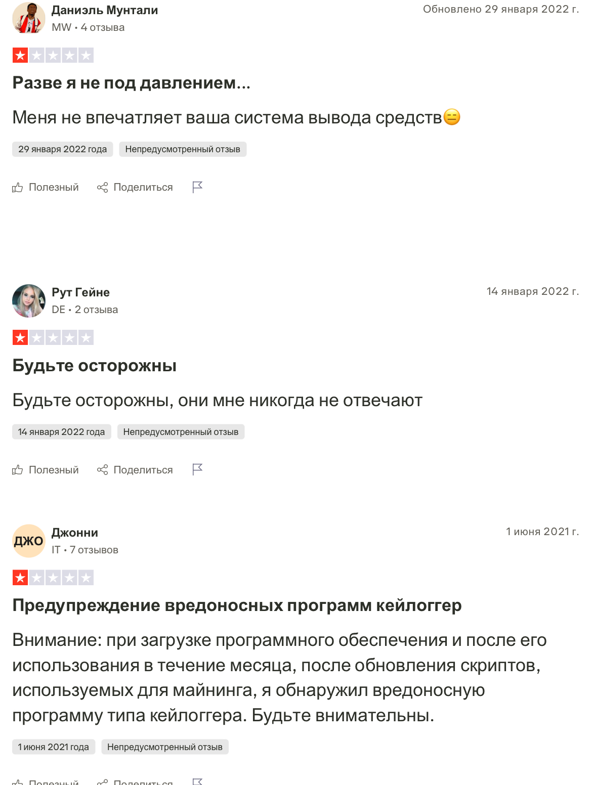 С другой стороны, на TrustPilot другое отношение к сервису. Средняя оценка — 2,8/5. Оставлено три комментария. Юзеры недовольны работой, в частности — пишут о проблемах с выводом средств. Также один пользователь отметил, что обнаружил вредоносное ПО в файле. Относительно заявлений компании о чистоте инструмента, такие замечания вызывают подозрения.