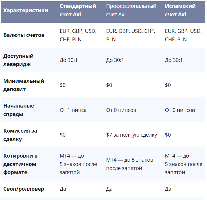 Минимальный депозит для открытия отсутствует. Можно начать торговать без первоначального взноса. «Акси ком» предлагает три типа счетов: