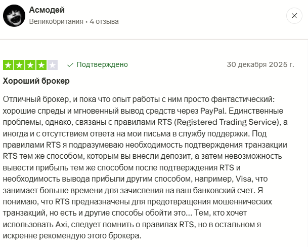 На Trustpilot больше 5 тысяч отзывов об Axi Trade. Положительных 82%. Многие хвалят низкие спреды. Вывод через PayPal быстрый. Клиенты отмечают стабильность.