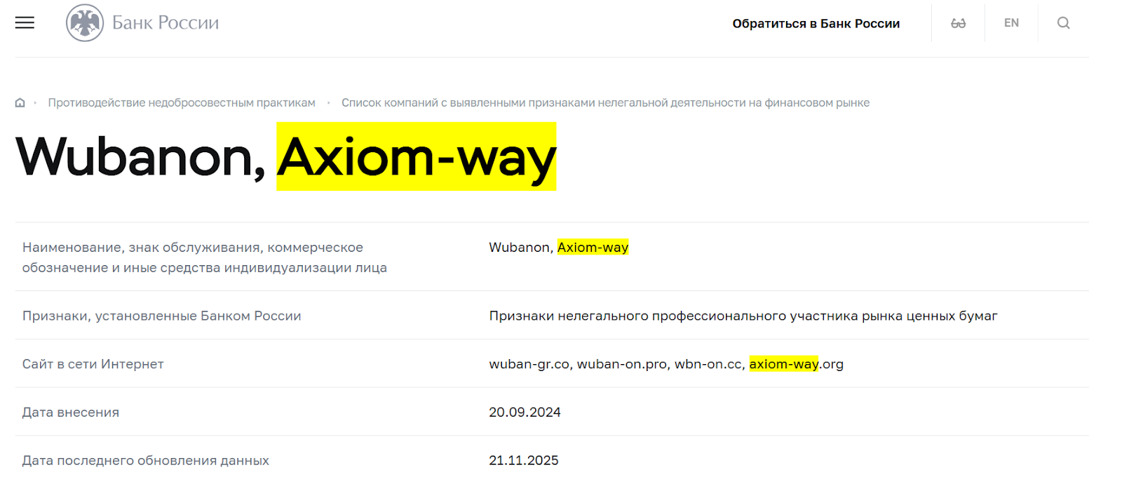 Axiom Way не сообщает о точном месте регистрации и не приводит на сайте компании лицензий и документов от организаций с островов Сент-Винсент и Гренадины, которыми платформа должна регулироваться. На сайте центрального банка РФ данный брокер фигурирует как нелегальный участник рынка ценных бумаг и находится в черном списке за недобросовестные практики.