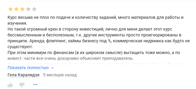 Отзывы о курсе «Азбука финансов» можно найти разные. В интернете есть и положительные оценки – обучение рекомендуют, подтверждая пользу знаний. Тут же уточняется, что курс дает только базу, а значит, не подходит для серьезных финансовых решений.