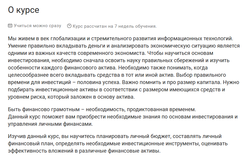 Курс «Азбука финансов» обещает раскрыть основы инвестирования за семь недель. Программа включает 44 урока общей длительностью 6 часов 47 минут. Помимо этого, ученики проходят 353 теста для закрепления теории. Что будет якобы раскрыто во время курса: