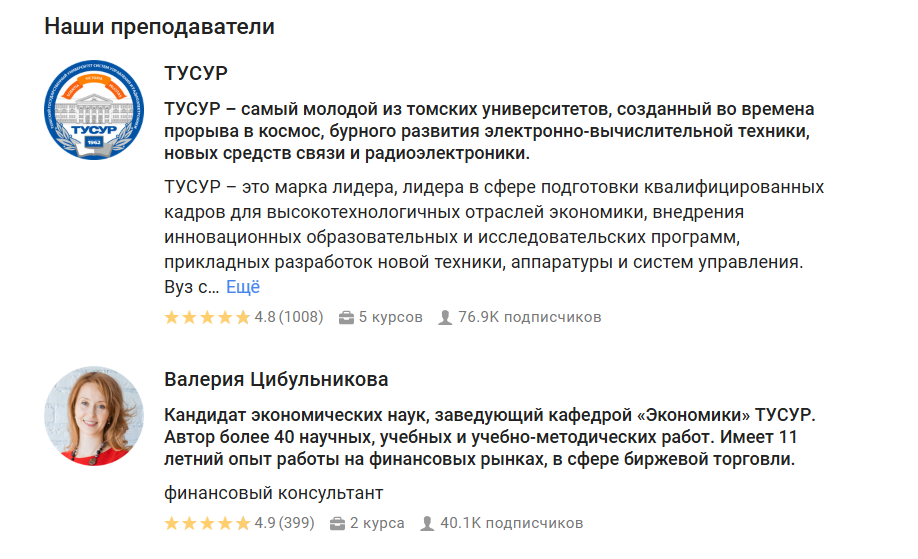 Над программой работали преподаватели ТУСУР, главным образом – Валерия Цибульникова, автор более 40 научных и учебных работ. Автор курса «Азбука финансов» имеет якобы 11-летний стаж биржевой торговли, но открытые источники не демонстрируют официальную отчетность по сделкам.