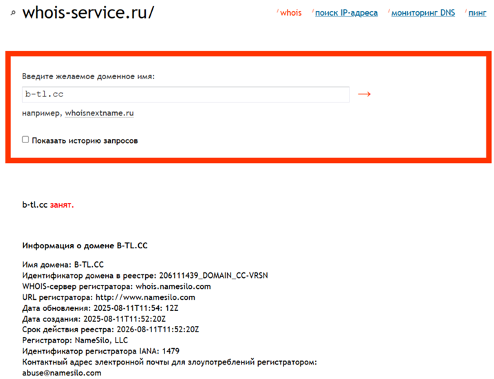 Сервис «Б Тл Сс» работает недолго – с 2025 года, поскольку именно тогда зарегистрирован доменный адрес. Это небольшой срок работы площадки, которая планирует работать с деньгами клиентов. Такой ресурс не заслуживает доверия, особенно, если дело касается больших инвестиций. А продлен доменный адрес до 11.08.2026 г.