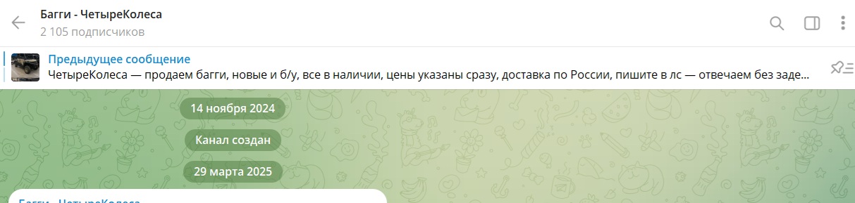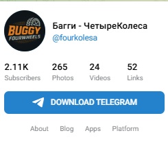 Основной канал в Телеграмм называется «Багги – Четыре Колеса» с ником @fourkolesa. Там публикуют объявления о продаже техники с фотографиями, характеристиками и ценой. Контент чисто коммерческий, никакого живого общения. Второй канал ATV Доставка РФ служит приманкой для более широкой аудитории и обещает прямые поставки из Китая по сказочным ценам.