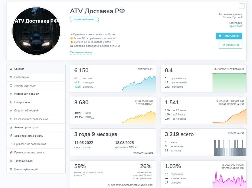 Канал «ATV Доставка РФ» выглядит еще страннее. Он создан недавно, но уже имеет более шести тысяч подписчиков. Хотя в описании авторы заявляют о десятилетнем опыте работы. Индекс вовлеченности держится на минимуме, при таком количестве подписчиков активность должна быть выше. Скорее всего, аудитория мертвая или накрученная.