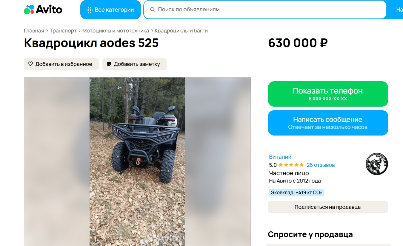 Обещания авторов выглядят очень заманчиво. Они предлагают новую технику по цене в несколько раз ниже рыночной. Например, квадроцикл Aodes 525 они продают за 169 тысяч рублей. Для сравнения, на популярных площадках вроде Авито аналогичная модель стоит около 630 тысяч. Такая разница в цене уже должна насторожить любого здравомыслящего покупателя.