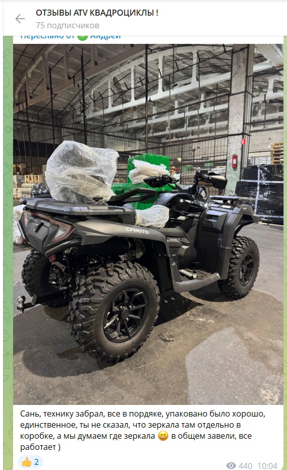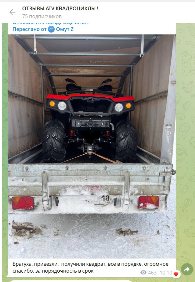 У продавца есть собственный канал с отзывами под названием «ОТЗЫВЫ ATV КВАДРОЦИКЛЫ» @otzvkvadro. На нем всего семьдесят пять подписчиков. Там публикуются скриншоты переписок с благодарными покупателями. Люди пишут, что техника пришла в целости, все работает, упаковка хорошая. Но доверять этим отзывам нельзя по простой причине: канал создан самими продавцами и полностью ими контролируется.