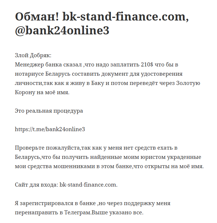 Bank24Online3 – аккаунт в Телеграм, который принадлежит службе поддержки белорусского банка ЗАТ Нацыянал Стандарт. Через этот аккаунт взаимодействуют с пользователями сайта bk stand finance com. Хотя на страницах веб-ресурса можно найти стандартные банковские услуги, основной продукт, который предлагается пользователям – возврат средств от брокеров-мошенников. Сама эта процедура имеет репутацию мошеннической, поэтому мы провели собственный разбор деятельности данной организации.