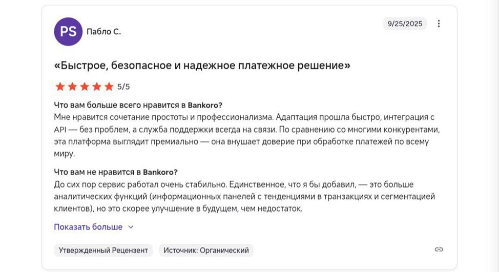 Отзывов о Bankoro очень мало. Русское комьюнити не комментирует деятельность платежной системы. Но и иностранцы не пользуются ею. Лишь один пользователь написал достаточно положительный отзыв. Он хвалит создателей за простоту и профессионализм. Платформа якобы внушает доверие при обработке платежей. Клиент советует добавить больше аналитических функций. В телеграм-канале запрещены комментарии. Хотя там клиенты могли бы оставлять свое мнение о платформе. Значит, создатели намеренно пытаются скрыть отзывы пользователей. Возможно, они чаще всего отрицательные. Поэтому, разработчики не стали портить себе репутацию.