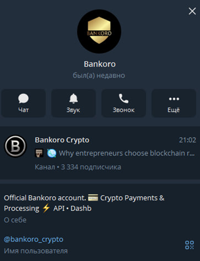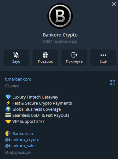 Платежная система имеет свой телеграм-канал Bankoro Crypto. Он создан 1 сентября 2025 года. Аудитория насчитывает 3,3 тысячи подписчиков. Публикации набирают около 1,5 тысяч просмотров и по 5 реакций. Комментировать их нельзя. Половина подписчиков явно накручена. В канале публикуются новости. Там рассказывается, как защитить свой бизнес от волатильности с помощью стейблкоинов. Проводятся анализы реальных компаний. Кроме этого, публикуются ответы на распространенные вопросы. Канал ведется на английском языке.
