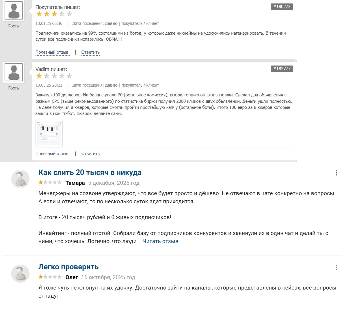 Негативных комментариев также очень много. В них клиенты утверждают, что практически все подписчики — “мертвые души” и боты. Они дают только количество, в реальная активность и просмотры почти нулевые. Рекламный бюджет слит впустую.