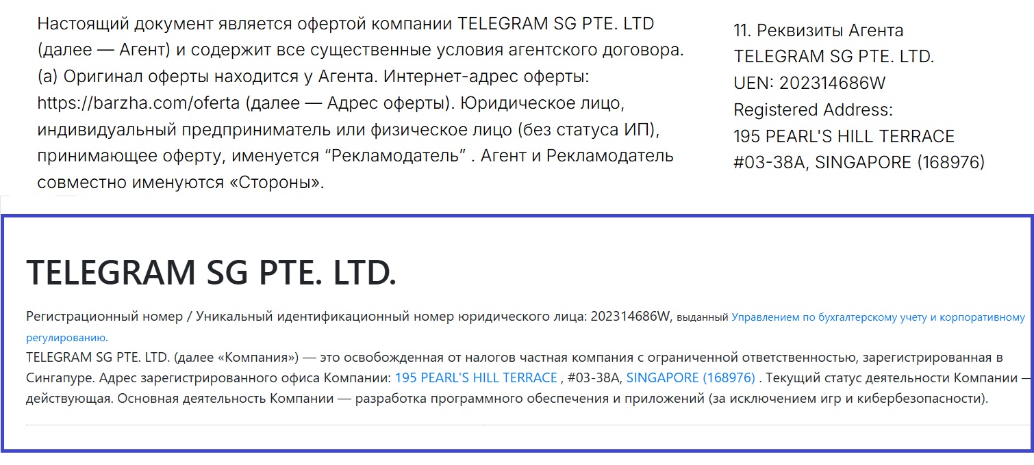 Владельцы позиционируют свой сервис как первый маркетплейс ТГ-рекламы с оплатой за результат и акцентом на новые форматы размещения. В договоре оферты указано, что компанией-оператором якобы выступает сингапурская фирма TELEGRAM SG PTE. LTD. Проверка показала, что она зарегистрирована 18 апреля 2023 года, но это небольшая частная компания, которая занимается разработкой ПО и приложений. У нее нет ничего общего с платформой Телеграм и никаких услуг в России она не предоставляет