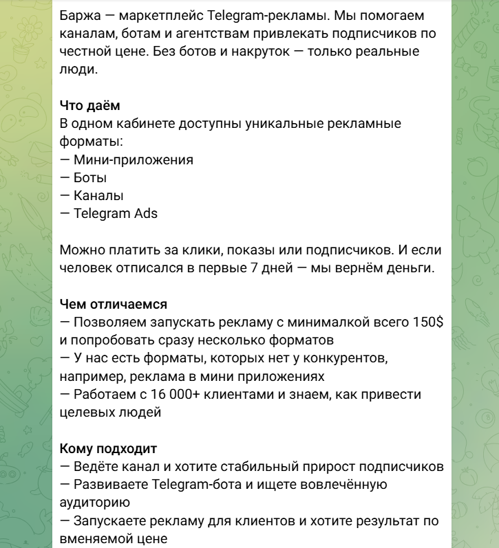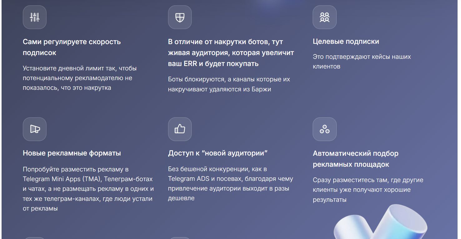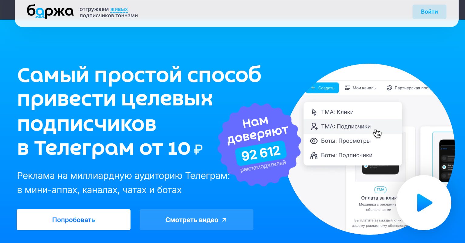 Основные маркетинговые формулировки Баржи включают в себя обещания дать доступ к миллиардной аудитории Телеграмм, быстро запустить рекламу в автоматическом режиме и обеспечить живых подписчиков от 10 руб.