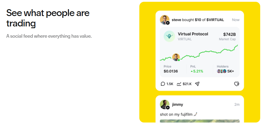 Внутри приложения функционирует социальная лента, созданная на Farcaster-протоколе. С ее помощью пользователи могут выполнять следующие действия: